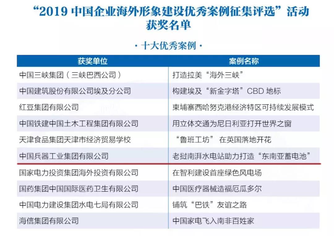 12月3日,由國務(wù)院新聞辦公室、國務(wù)院國資委、全國工商聯(lián)指導(dǎo),中國外文局主辦,中國報(bào)道雜志社承辦的“2019·中國企業(yè)海外形象高峰論壇”在北京舉行,由中國報(bào)道雜志社和國務(wù)院國資委新聞中心聯(lián)合開展的“2019中國企業(yè)海外形象建設(shè)優(yōu)秀案例征集活動(dòng)”評(píng)選結(jié)果揭曉,中國兵器工業(yè)集團(tuán)北方公司老撾南湃水電站項(xiàng)目榮獲2019中國企業(yè)海外形象建設(shè)十大優(yōu)秀案例及卓越社會(huì)責(zé)任獎(jiǎng)。