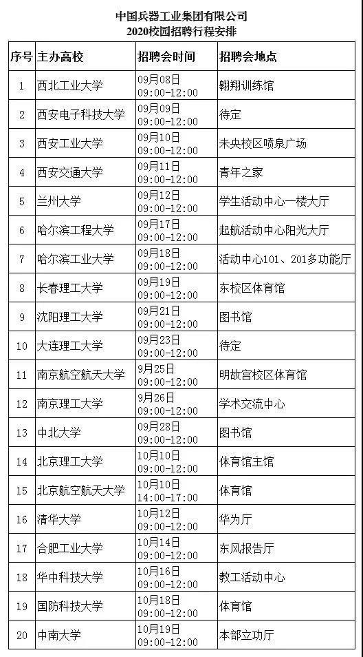 中國兵器工業(yè)集團2020屆校園招聘會將在全國12個城市、20所高校舉辦,招聘會具體行程見下表: