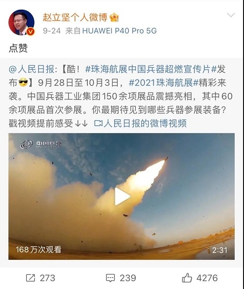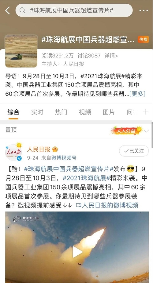 人民日報(bào)、新華社、中國日報(bào)、共青團(tuán)中央、國資小新、騰訊軍事、鳳凰軍事、新浪軍事等新媒體發(fā)布的集團(tuán)公司航展宣傳片等視頻作品燃爆全網(wǎng),閱讀量突破三千萬人次,得到外交部發(fā)言人趙立堅(jiān)轉(zhuǎn)載點(diǎn)贊。集團(tuán)公司微信、微博、抖音號、微信視頻號等新媒體宣傳片播放閱讀量超過400萬人次。同時(shí),央視新聞、新華社、中國之聲、央視軍事、央視新媒體、解放軍報(bào)、共青團(tuán)中央、國資小新、環(huán)球時(shí)報(bào)等多家媒體對集團(tuán)公司靜、動態(tài)展區(qū)進(jìn)行現(xiàn)場直播,在電視端、客戶端、微信視頻號、微博、B站、快手、抖音等平臺受到高度關(guān)注。著名軍事專家杜文龍、央視主持人顧國寧、央廣中國之聲主持人王藝等直播兵器館、動態(tài)表演區(qū)裝備。