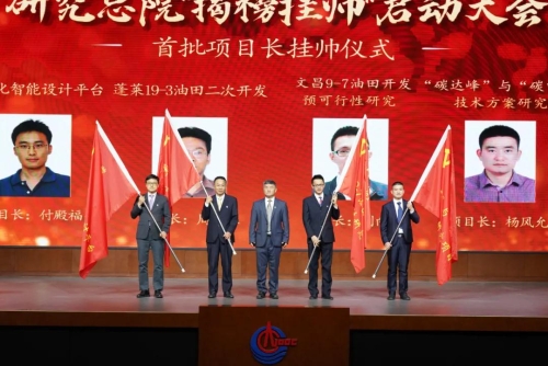 圖為中國海油所屬研究總院揭榜掛帥啟動(dòng)大會(huì)首批項(xiàng)目長掛帥儀式。