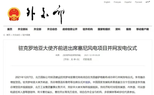 2021年12月7日,中國兵器工業(yè)集團有限公司北方公司所屬北方國際投資、建設(shè)和運營的塞尼156MW風(fēng)電項目在克羅地亞首都薩格勒布隆重舉行并網(wǎng)發(fā)電儀式。李克強總理致賀信??肆_地亞總理安德烈·普連科維奇,中國駐克羅地亞大使齊前進出席儀式并致辭。中國國家發(fā)展和改革委員會副主任寧吉喆宣讀李克強總理賀信并視頻致辭,中國兵器工業(yè)集團有限公司董事長焦開河、克駐華大使米海林視頻致辭。