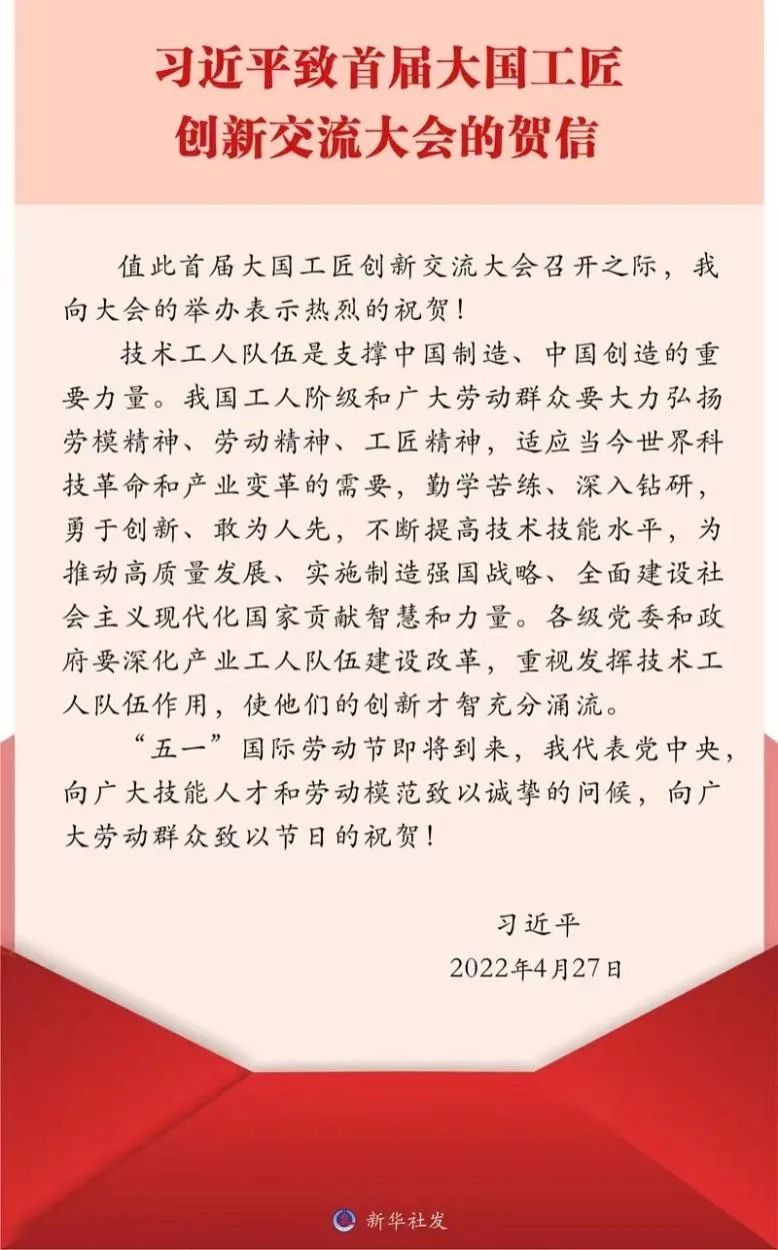 2022年4月27日,由中華全國(guó)總工會(huì)主辦,廣東省總工會(huì)、深圳市人民政府、中國(guó)職工技術(shù)協(xié)會(huì)承辦,各省、自治區(qū)、直轄市和各全國(guó)產(chǎn)業(yè)工會(huì)組織所屬單位參加的首屆大國(guó)工匠創(chuàng)新交流大會(huì)(以下簡(jiǎn)稱(chēng)“大會(huì)”)在北京開(kāi)幕。中共中央總書(shū)記、國(guó)家主席、中央軍委主席習(xí)近平發(fā)來(lái)賀信,向大會(huì)的舉辦表示熱烈的祝賀,并在“五一”國(guó)際勞動(dòng)節(jié)到來(lái)之際,代表黨中央向廣大技能人才和勞動(dòng)模范致以誠(chéng)摯的問(wèn)候,向廣大勞動(dòng)群眾致以節(jié)日的祝賀。