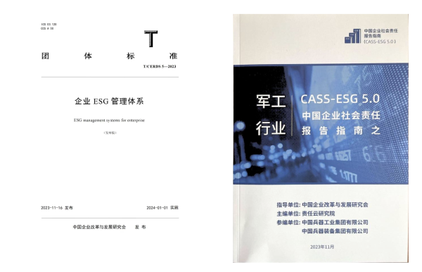 積極參與行業(yè)內(nèi)外社會責任生態(tài)建設(shè)。積極開展社會責任相關(guān)研究。集團公司作為參編單位參與了國務院國資委組織中國質(zhì)量協(xié)會開展的《企業(yè)ESG評價指南》《企業(yè)ESG管理體系 要求》(團體標準)的編制工作,為ESG工作奠定堅實的基礎(chǔ)。組織兵器規(guī)劃院與社科院責任云研究院合作,開展了《軍工集團ESG管理體系研究》課題研究,結(jié)合軍工行業(yè)特點,搭建軍工集團ESG管理模型和指標體系。為提升對上市公司ESG報告編制的指導性,編制《集團公司ESG報告指南(2023)》(上市公司),為上市公司ESG報告編制提供全過程支撐。在“首屆中國上市公司可持續(xù)發(fā)展大會”上,中國企業(yè)改革發(fā)展研究會發(fā)布了集團公司起草參編的《企業(yè)ESG管理體系》(T/CERDS5—2023)團體標準,在“2023中國企業(yè)社會責任報告峰會”上,正式發(fā)布了由集團公司參編支持的《中國企業(yè)社會責任報告指南(CASS-ESG5.0)之軍工行業(yè)》。